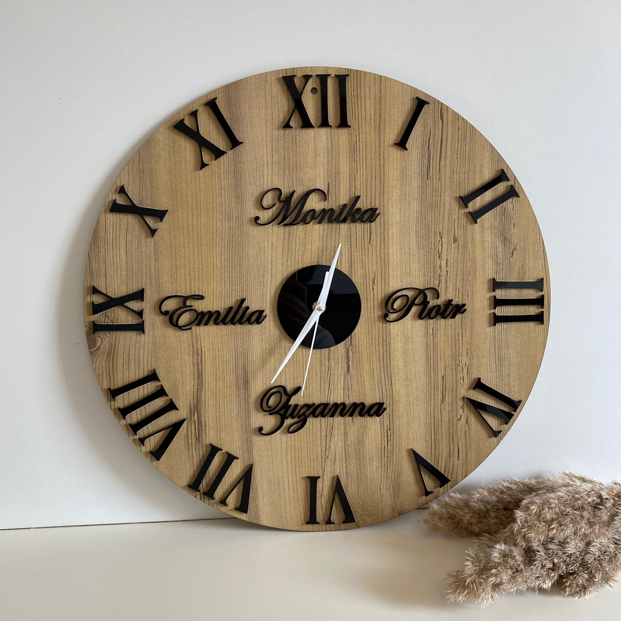 Wanduhr mit Namen in Holz - Römische Zahlen