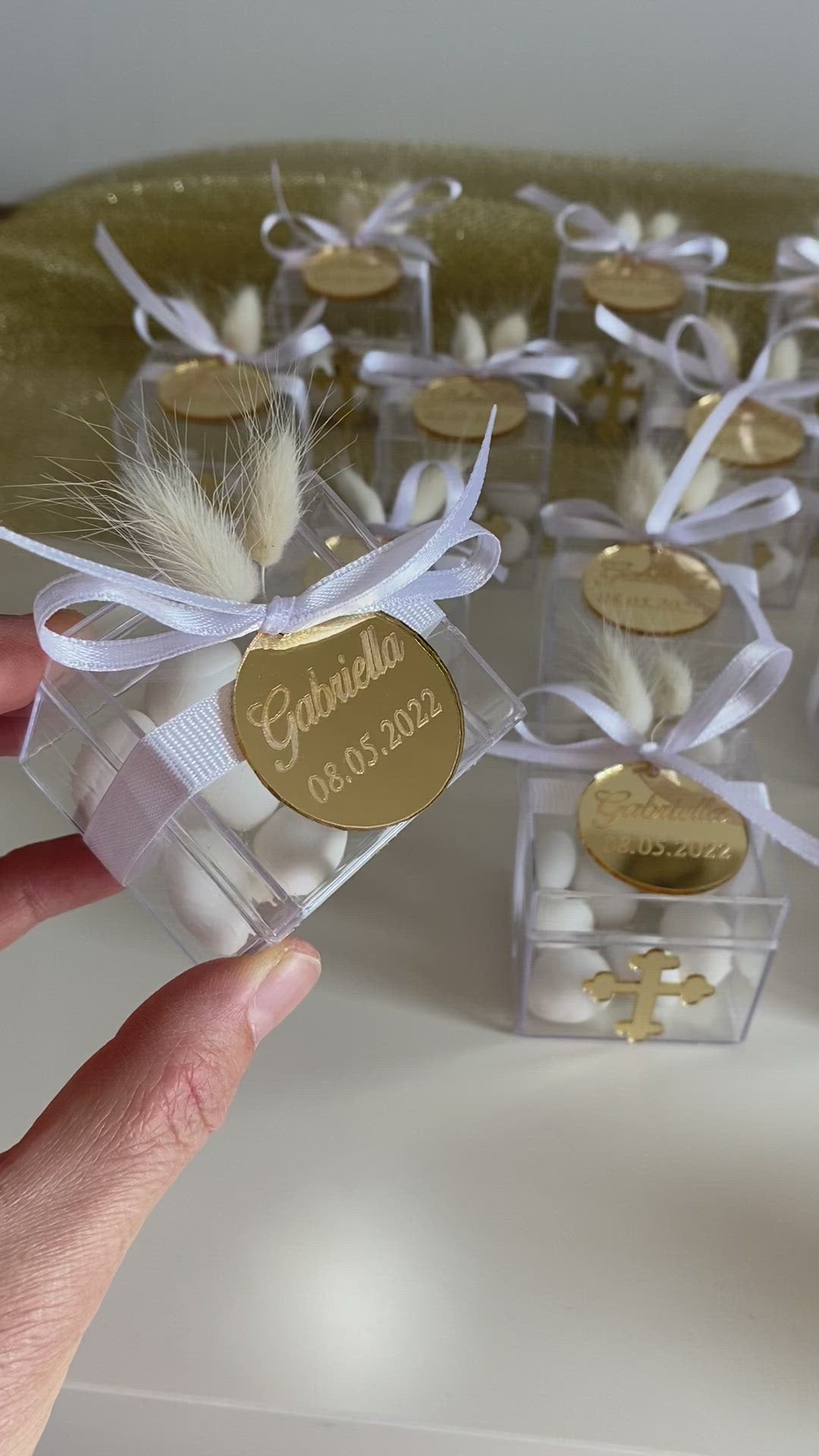 Überrasche deine Gäste mit personalisierte Gastgeschenke zur Taufe: Edle Taufmandeln in eleganter Plexi-Verpackung mit Gravur. Jede Mandeln steht symbolisch für Glück, Liebe, Gesundheit und Wohlstand – ein wundervolles Andenken für diesen besonderen Tag.